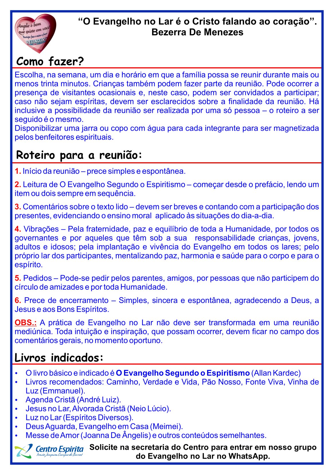 Se desejar temos um grupo de WhatsApp com Evangelho no lar todas as segundas-feira às 21h.